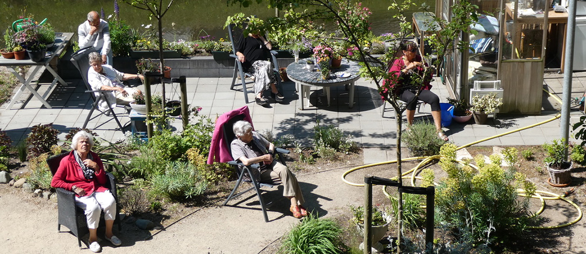 In de tijd waarin we 1,5 meter afstand van elkaar moeten houden was het geen probleem om in deze tuin een plekje te vinden voor iedereen. Maar niet alleen in de tuin, ook op de galerij of op het balkon hadden de bewoners zich opgesteld. Naast de bewoners van de woongroep waren ook veel andere bewoners van het complex aanwezig en genoten mee van de prachtige muziek van zangeres en gitarist Julie Scott en Roeland Drost op piano. Zij maken al 25 jaar lang samen muziek en zijn beste vrienden.