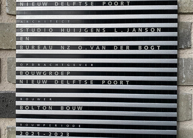 Het is bijzonder om mijn zelfstandige architectenpraktijk na ruim 30 jaar met de ingebruikname van Nieuw Delftse Poort officieel af te sluiten. Daarom was het voor mij extra feestelijk om voor dit gebouw in november samen met Bruno Ninaber van Eyben, de door hem ontworpen Architectuurplaquette op de gevel te monteren. Een blijvende herinnering aan het team dat dit project met zoveel energie en grote betrokkenheid heeft gerealiseerd!
