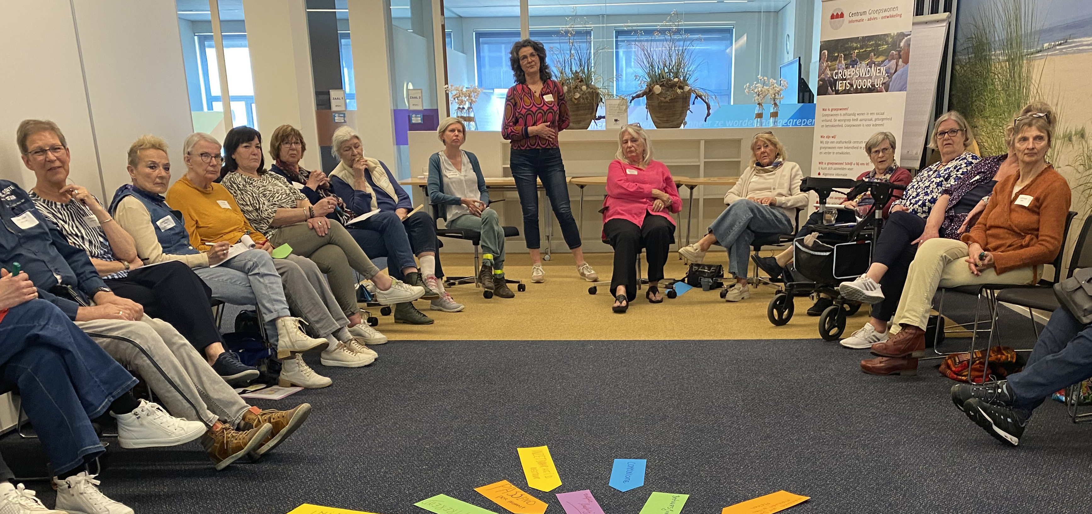 Woensdagmiddag 1 mei 2024 vond weer onze tweede inspiratie- netwerkmiddag van dit jaar plaats. 15 Haagse woongroepen bespraken met elkaar hoe ze omgaan met reservekandidaten. We begonnen de bijeenkomst met alle 32 deelnemers in een grote kring. Naar aanleiding van een korte presentatie ontstond er een geanimeerd groepsgesprek waarbij iedereen zijn/haar ervaringen kon delen. Door middel van gekleurde pijlen hebben we een aantal thema's wat verder uitgediept. De middag werd afgesloten met een hapje en een drankje en de gelegenheid om na te praten.
