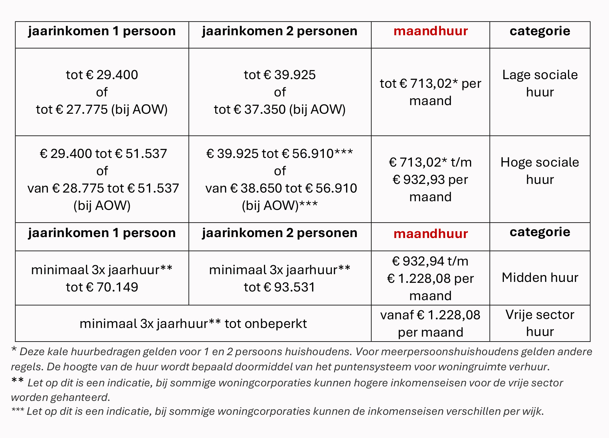 Onderstaande bedragen zijn wettelijk vastgesteld voor 2025. De inkomenseisen betreffen het fiscale belastbaar jaarinkomen (bruto), te zien op een inkomensverklaring van de belastingdienst (IB60).