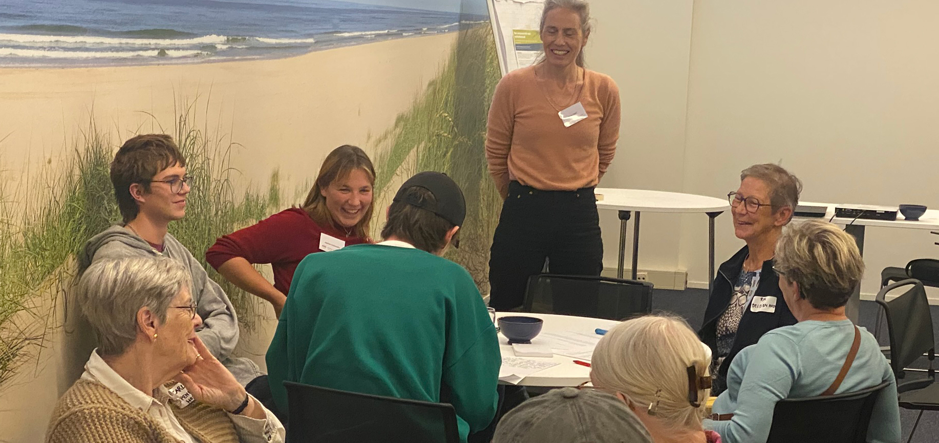 De Haagse Hogeschool heeft een onderwijsprogramma waar het ontmoeten van ouderen centraal staat. Hoe maak je een ruimte optimaal om elkaar te kunnen ontmoeten? Studenten vertelden over hun (ontwerp)onderzoek en gingen in groepjes in gesprek met de woongroepbewoners en stelden vragen over hoe zij hun gemeenschappelijke ruimten nog beter zouden kunnen gebruiken.