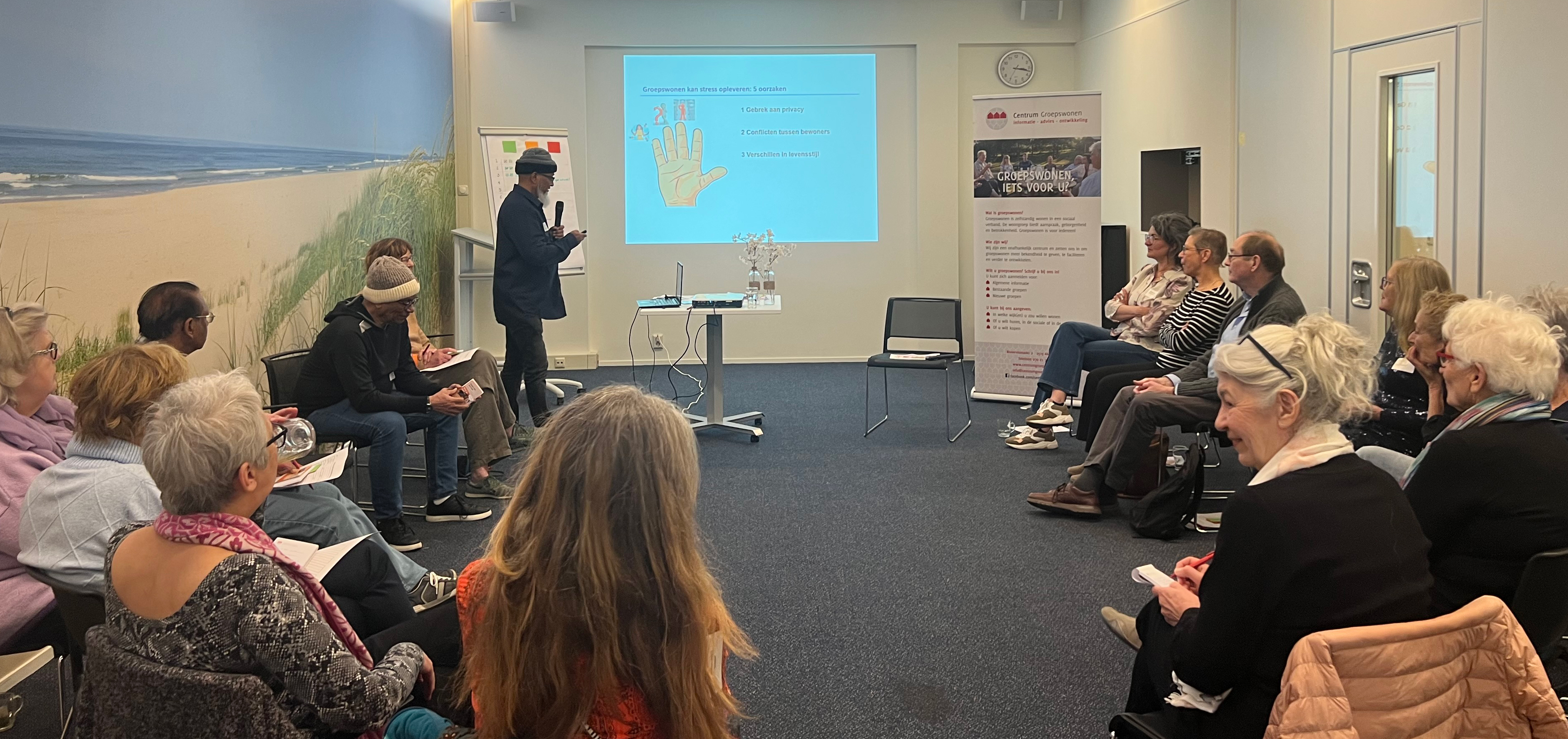 Woensdag 26 maart 2025, organiseerden we weer een inspiratiemiddag voor woongemeenschappen. Dit keer was het thema Vitaliteit. In een woongemeenschap heb je bij uitstek de kans om zeer goede buren van elkaar te zijn zonder elkaars mantelzorger te worden. Maar hoe doe je dat? Hoe zorg je voor je eigen vitaliteit en tegelijk samen voor de vitaliteit van de groep?