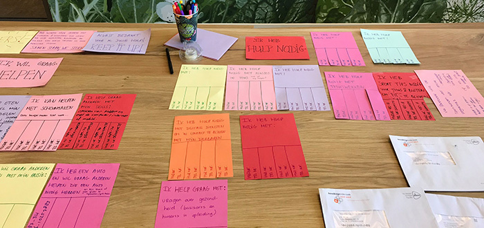 Door middel van speciale briefjes op de tafel in de entree hal van appartementen complex Harvest laten de betrokken bewoners van Harvest aan elkaar weten dat ze er voor elkaar zijn. Je kan laten weten dat je hulp aanbiedt of graag wil ontvangen. Een mooi initiatief!!