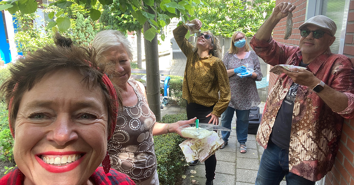 De muzikanten werden zeer gastvrij en op echt Scheveningse wijze ontvangen; bij aankomst een heerlijke kop koffie en na afloop niet alleen een grote bos bloemen voor Pier en Leonie, maar een heerlijke nieuwe haring voor iedereen.
