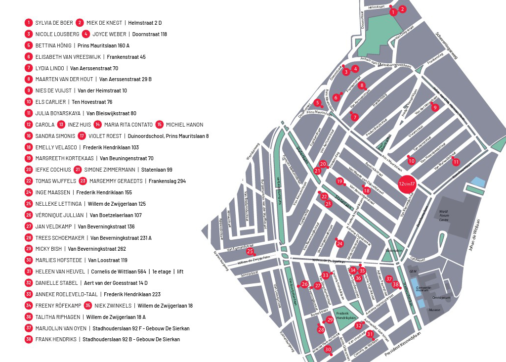 38 kunstenaars op 28 unieke locaties in de wijk vol creativiteit in Den Haag. Wandel van locatie naar locatie en laat je inspireren door schilderkunst, beeldhouwkunst en veel meer.